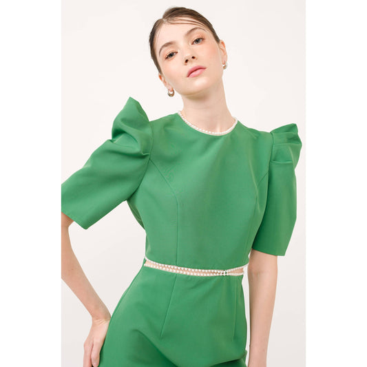 Short Puff Sleeve Pearl Trim Cut out Mini Dress