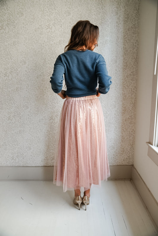 DANCE THE NIGHT AWAY SEQUIN MESH TULLE MIDI SKIRT