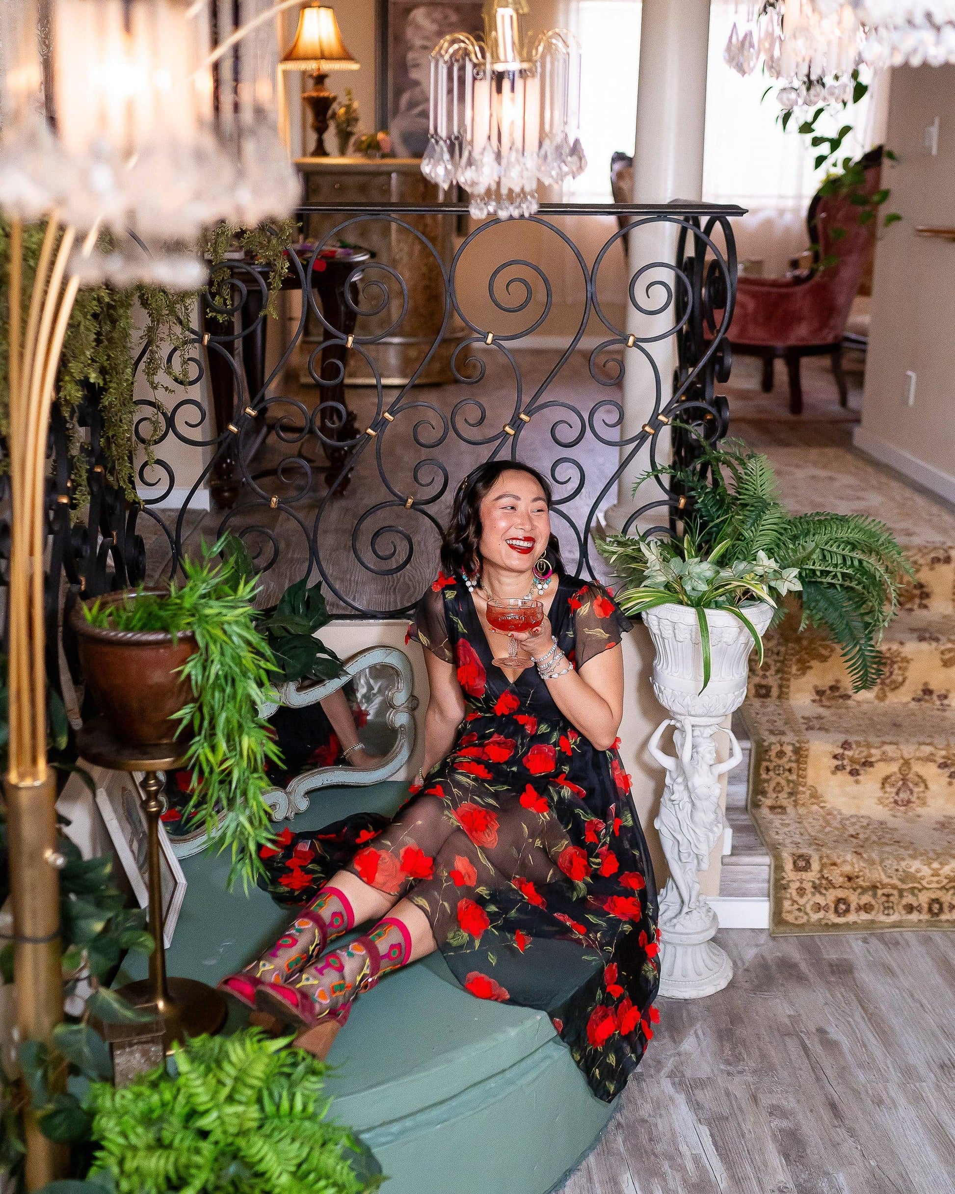Our Cocktail Hour black sheer sock features wine glasses, martinis, and wine bottles with an unexpected olive twist. The graphic print and electrifying colors give this sock an art museum vibe, perfect for paint and sip nights with the girls. Finished with a mulberry colored cuff, heel, and toe for a sultry look.