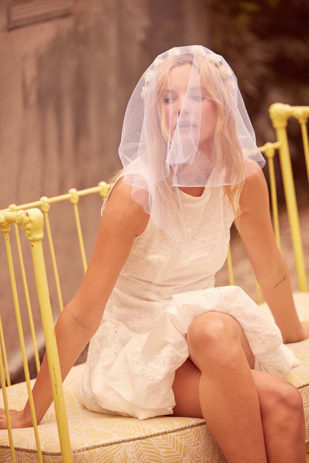 An eyelet lace mini dress with the following features:
