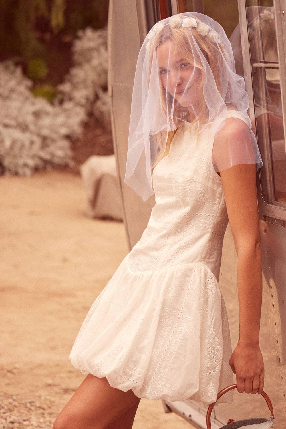 Eyelet Lace Boatneck Drop-Waist Bubble Mini Dress