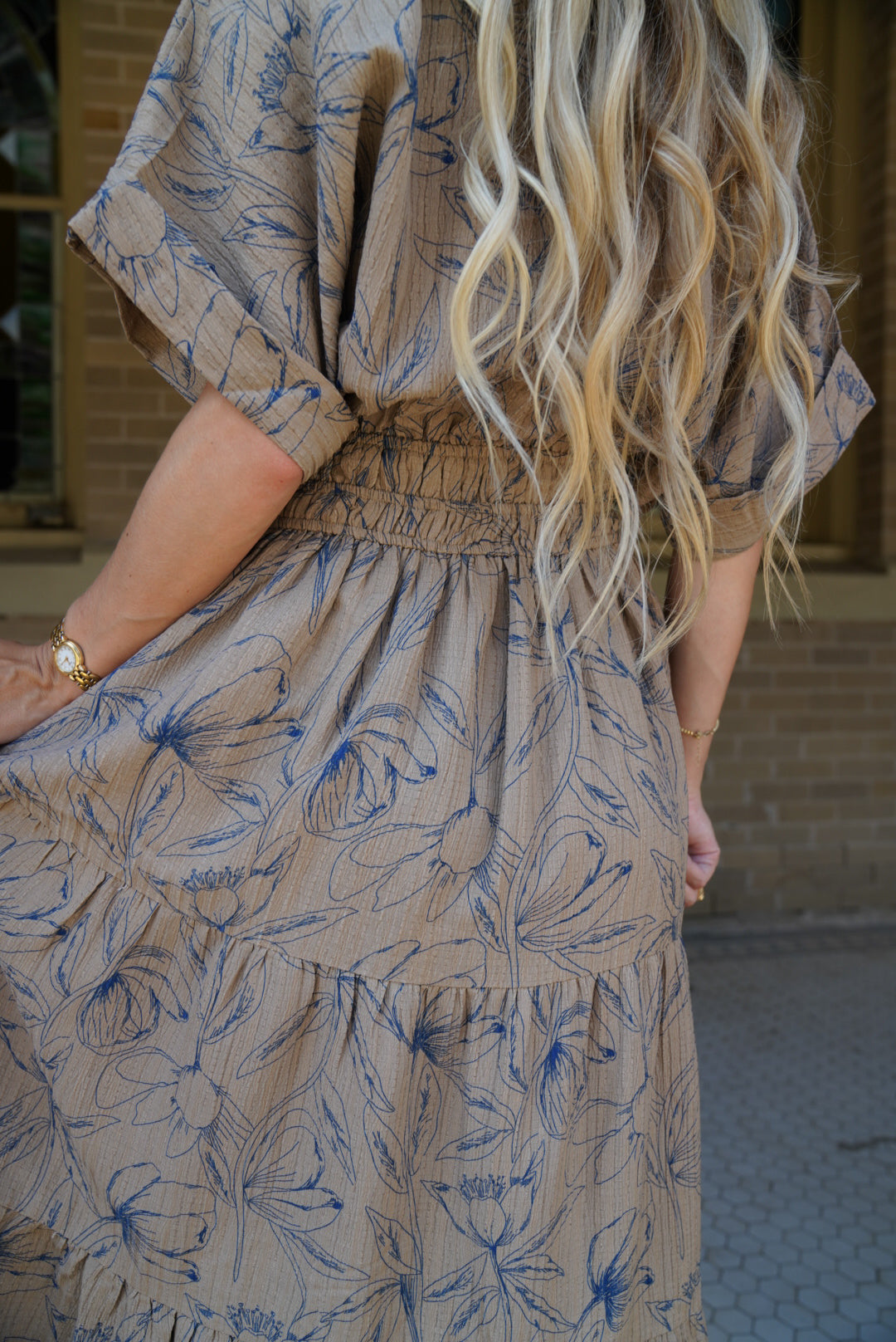 A softly romantic silhouette for cooler days. This maxi dress is adorned with a vintage-inspired floral print and finished with layered ruffles that move with you. The dolman sleeves and split neckline add a relaxed elegance, while the elastic waist brings gentle shape. Designed with lined fabric and functional side pockets for everyday ease. Perfect for fall transitions, weekend plans, or an intimate holiday gathering. Now shipping — a timeless piece to elevate your seasonal collection. Features - Split neck - Collared - Dolman sleeves - Cuffed sleeves - Romantic floral print - Maxi dress - Tiered ruffles - Elastic waist - Textured fabric - Side pockets.